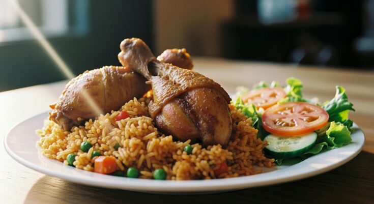 Jollof rice with chicken and salad is one of those meals that instantly brings people together. Anytime I cook this dish, it feels like a celebration, whether it’s a quiet family dinner or a lively weekend gathering. The rich tomato-based rice, perfectly seasoned chicken, and crisp fresh salad create a balance of flavor, texture, and color that makes this meal irresistible. For me, jollof rice is more than just food; it’s culture, comfort, and pride served on a plate.